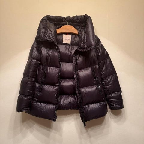 Moncler-dunkappan i klassiska dammodellen Flammette, något insvängd och med huva som infälld bildar hög, skyddande krage.