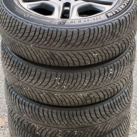 Däck: helt nya Nokian Hakkapeliitta 10 SUV dubbdäck 235/55 R19 (19tum) endast rullat 2 veckor. Hjulen har suttit på en Toyota Rav 4 2025, passar säkert flera bilmärken.