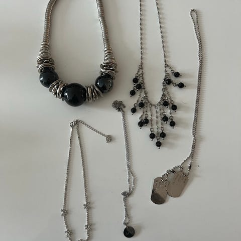 Diverse smycken. Halsband, armband, örhängen, ringar. Två halsband längst till höger på bild 1 (pärlhalsband och glashjärtan) har trasiga spännen. Sista bilden halsband där det saknas en sten. Örhängen som sitter på svart dyna saknar ploppar, dom finns även bara 1 av varje. Fler örhängen som finns 1 av, det som är på bilderna är det som är. Bild 1 är allt som ingår. Allt för 200:-