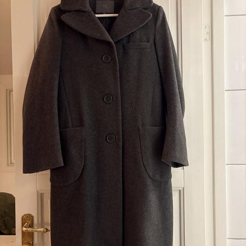 Lång Ullkappa från Source Unknown. Denna kappa är oanvänd och har en otrolig figursydd passform. Denna kappa är storlek 38 (M). Men passar även en storlek S (36)