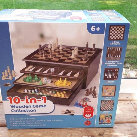 Olika spel och pärlor i sorterade fack efter färg. Nabbi pärlor.
