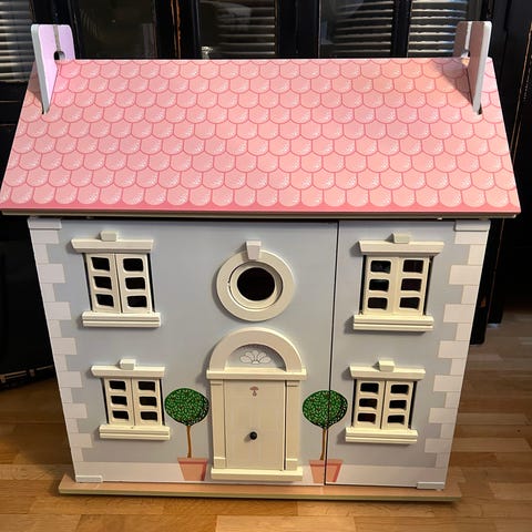 Dockhus med mycket möbler, tillbehör och dockor. Gott skick men två fönsterluckor provisoriskt lagade.
