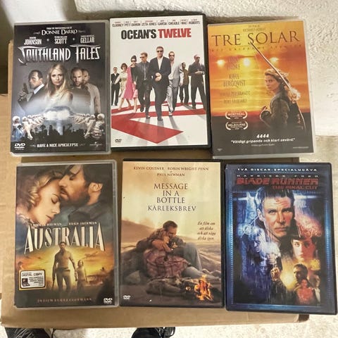 En samling DVD-filmer inklusive Me Before You, How to Be Single, Hundraåringen som klev ut genom fönstret och försvann, samt Avatar. Filmerna är i standard DVD-format.