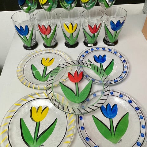 Nya skål och 4 fat "Kosta Boda – skål och fat Tulipa, Design: Ulrica Hydman Vallien "som hennes signatur finns på alla. Samlarföremål.Säljer allt tillsammans för 1500 kr.