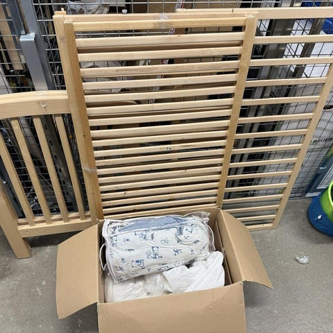 Spjällsäng med möjlighet för 3 höjdlägen. Den har en låda under och kan omvandlas till vanlig säng genom att byta ut ena sidan.