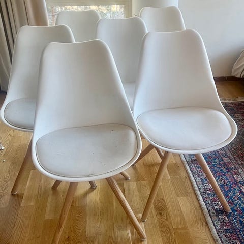 Tvp av stolarna har varsit litet märke i färgen, se sista bilden. Tyget på stolarna kan enkelt tas av och tvättas eller bytas ut om man skulle vilja. Säljes endast för upphämtning i Älta.