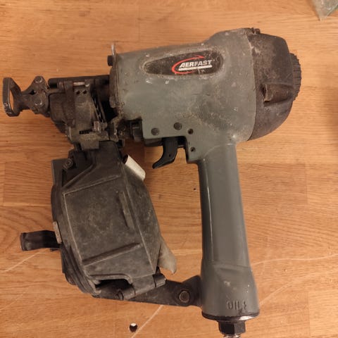 PASLODE tryckluftsdriven Luft/Pappspik pistol (5,5-8,3 bar för 0° pappspik på 35-65mm). Snabbladdat magasin för upp till 325 spikar. I fint skick. Nypris för denna modell är ca 9000 kr. Pris för båda 3300kr.