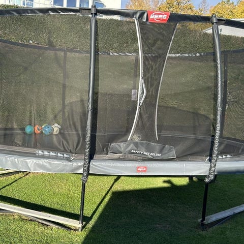 Allmänt gott skick – ramen är stabil, fjädrar hela och säkerhetsnät samt basplattform ingår.