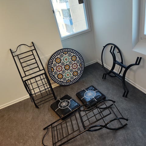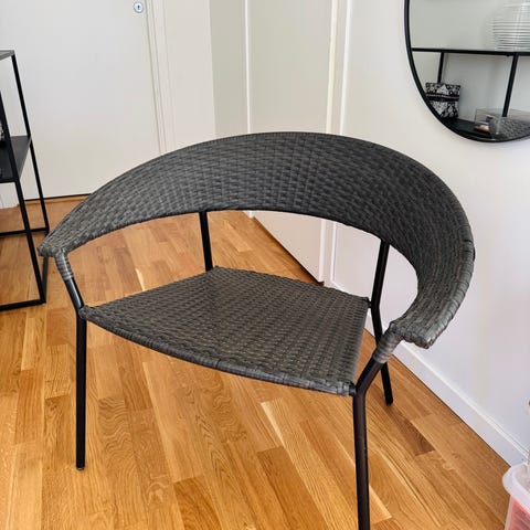 + lounge-pall (nypris 1849 kr), som antingen kan sättas fast som en förlängning för att skapa en stol man kan ligga i, sitta på separat eller använda som bord med en bricka på. Två fästen ingår för att fästa delarna med varandra.