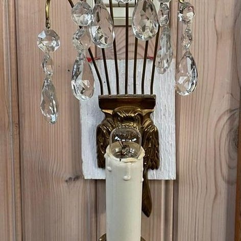 Äldre retro / vintage / antik lampa / vägglampa / vägglampett i kristall / mässing. Glödlampa ingår ej.