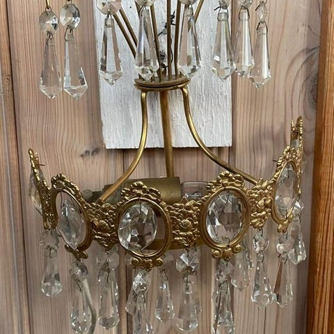 Äldre retro / vintage / antik lampa / vägglampa / vägglampett i kristall / mässing. Gammal kontakt. Stämpel lys & stil. Glödlampa ingår ej.