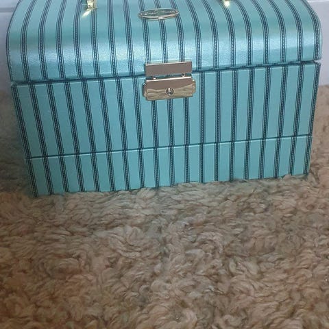 Vintage smyckesskrin med silverfot och präglad ros på toppen.