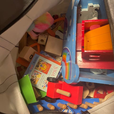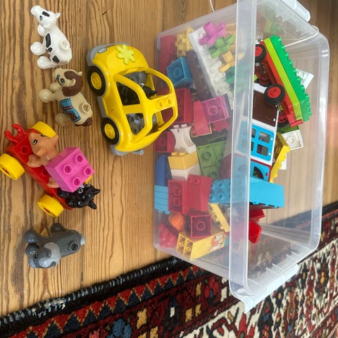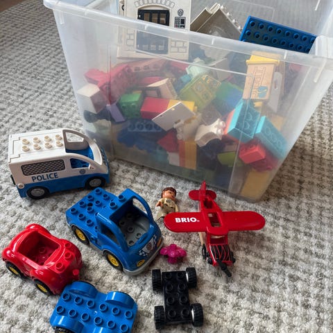 Säljer en låda full med Greta Gris / Peppa Pig leksaker. Många figurer, hus, flygplan, tåg, vägar, helikopter, bilar etc