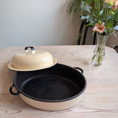 En oval gjutjärnsgryta med lock.