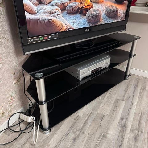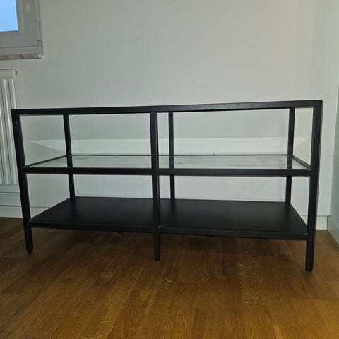 Svart tvbänk med glashyllor. 80cm x 45 cm.