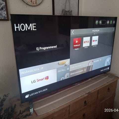 En LG smart TV jag tror den är 75 den är ganska stor ca tre år gammal sparsamt använd säljas för 7500 ny pris ca 14000