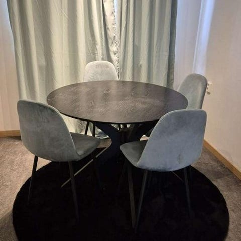 Bord+6stolar i fint skick inga skador Säljes separat om så önskas Bordsmått: 110dia, höjd: 78cm