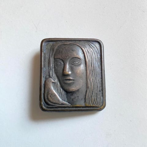 Vacker och mycket detaljrik brosch i tenn från HC Svenskt Tenn. Broschen är från 700-årsfirandet av Stockholm som stad 1953. Storlek ca 77 mm.