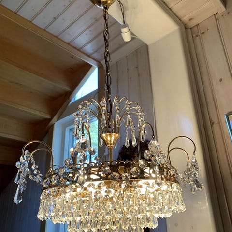 Mässingstomme och äkta kristallprismor. Sex lamphållare E14, glödlampor ingår inte. Diameter 40 cm, höjd 70 cm. Rengjord och klar för upphängning