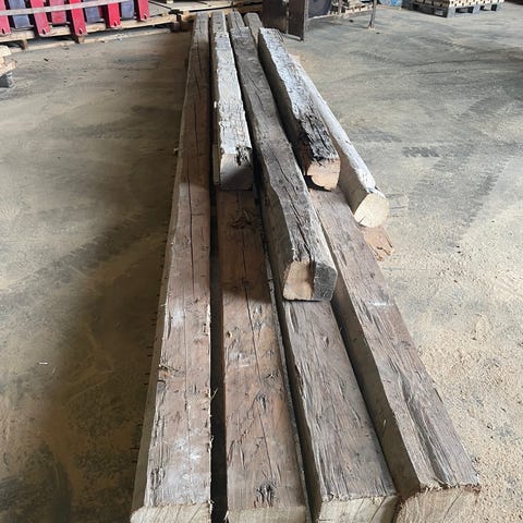 7st handskrädda bjälkar i olika längder, 6 av dem är mellan 2,5-3,3 meter, och en är ca 8 meter lång. Dimensionerna varierar, men de klenaste är 125x100mm. Virket är friskt och mycket fint, inga vatten eller väderskador. Sista bilden bjälkar från samma byggnad i ny miljö. 100kr/meter.
