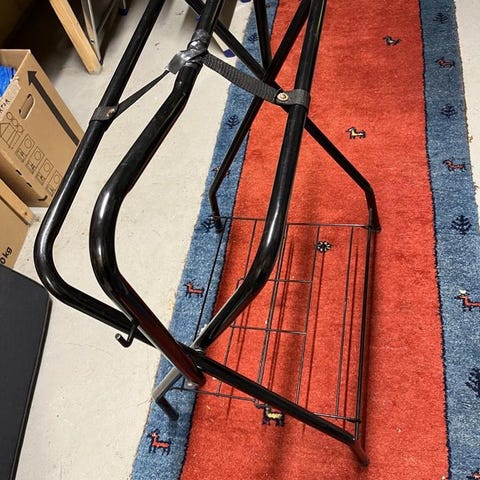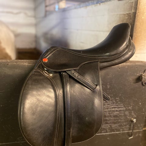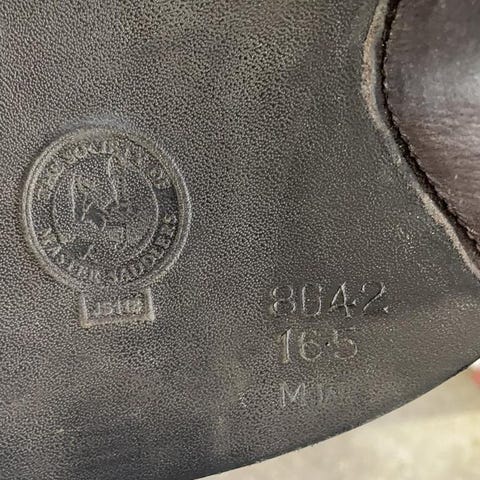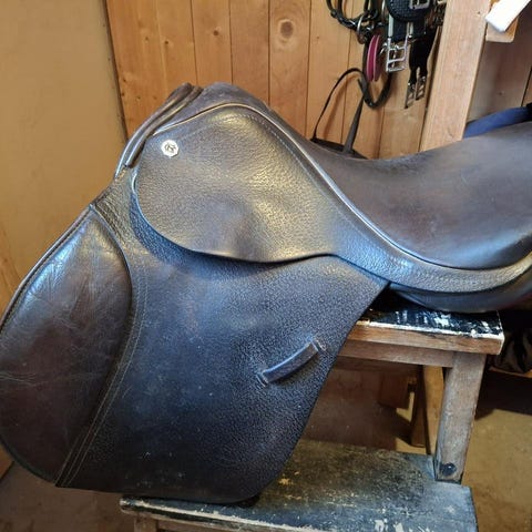 Hoppsadel. Svart. Bra skick, endast mindre märke på bakvalv. Utbytbara koppjärn.