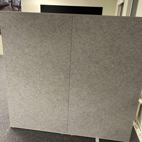 Grå ljudabsorberande skärmvägg med svart fot. Avskärmning för skrivbord.
