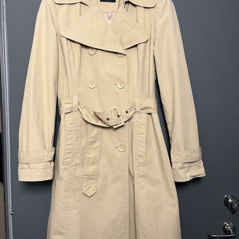 Jättefin kort trenchcoat från Miu Miu, jag har köpt den på Judiths second hand på Hornsgatan. Italiensk storlek 12, tycker den passar 36-38. Har en liten fläck på baksidan av högra axeln, upplever dock att den är blekare än den blev på bild. Finns på Lidingö.