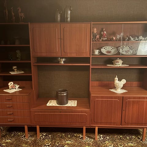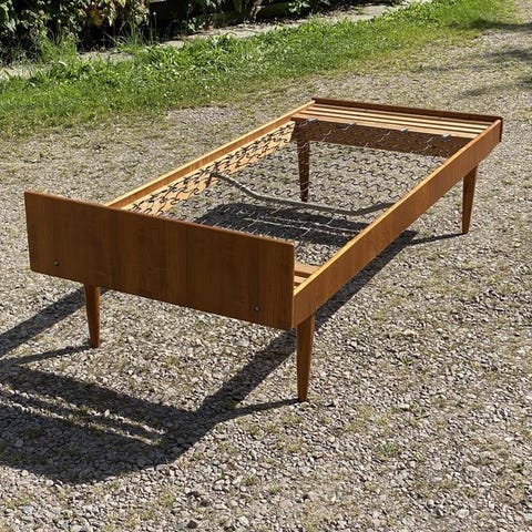 Teakstomme enkelsäng. En skumgummimadrass i hyfsat skick kan följa med om man vill.