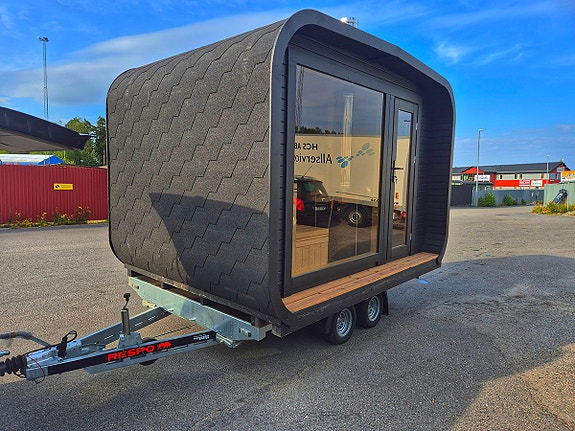 Byggd av svenskt Thermowood grantimmer 44 mm från norrland och en finsk bastukamin från Harvia.