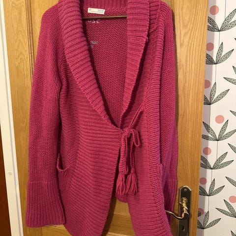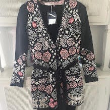 Klassisk Odd Molly kofta, mönstrad, finstickad i bomull med långa ärmar och knytband i midjan. Mjuk och fin kvalitet. Mörkblå och vit med beige band. Storlek 1/XS