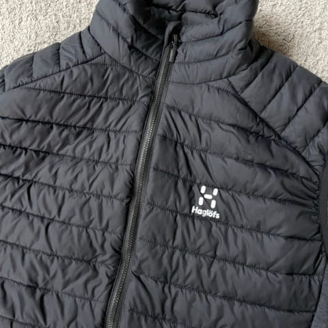 Svart väst med dragkedja framtill och Haglöfs logga på bröstet. Västen har vadderad fram- och baksida samt gråmelerade sidopaneler.