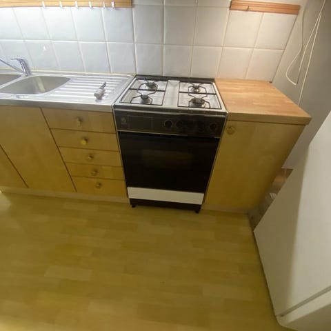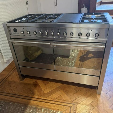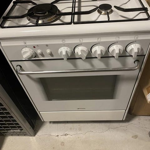Äldre fungerande gasspis med ugn. Något smutsig efter att ha stått i en lada.