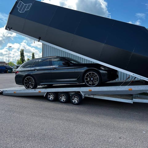 5,5 m BILTRAILER FÖR SPORTBILAR 4P TrackDay har marknadens lägsta chassi och en näranog nollvinkel vid lastning och lossning. Den klarar även bilar med de lägsta frigående, som Porsche 996, 997, 991, 992, GT3 RS, 964 ,993, men också Lamborghini, Ferrari och Maserati.’ Kåpa med fri höjd 160 cm.