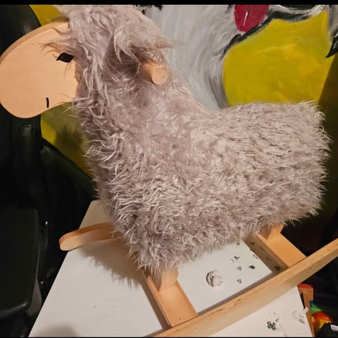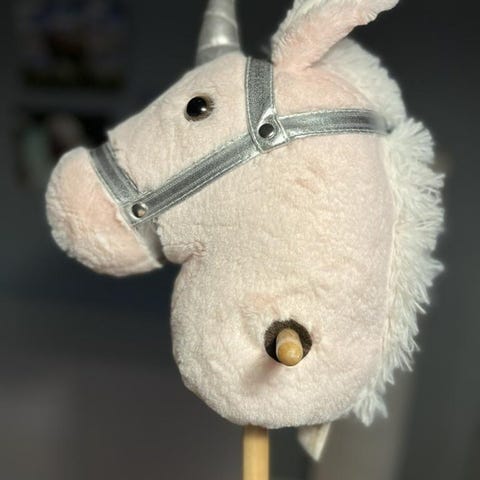 Gunghäst enhörning från Teddykompaniet. Mankhöjd 50 cm, höjd inkl. huvud 70 cm, längd inkl. medar 72 cm. Med ljud.