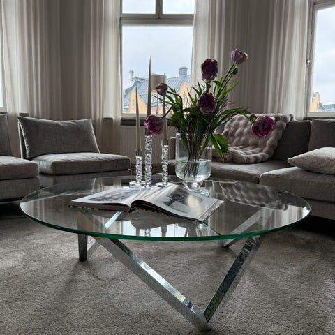 Soffbord i kvadratisk form med bordsskiva i glas och benstativ i metall. Bordet har en genomskinlig glasskiva som ger en öppen känsla och gör det enkelt att se mattan eller golvet under. Metallbenen är placerade i hörnen och ger stabilitet. Passar som soffbord eller sidobord i vardagsrum eller loungeyta.