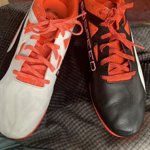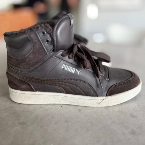 Jag säljer dom här PUMA skorna i storlek 38,5 eftersom att dom nu är för små. Dom har en sula på 3,5 cm i hälen och 2,5 cm i tårna. Dom är i super bra skick men synligt använda. Dom har en lätt och styv kolfibersula vilket gör att man får mer spänst när man springer och hoppar.