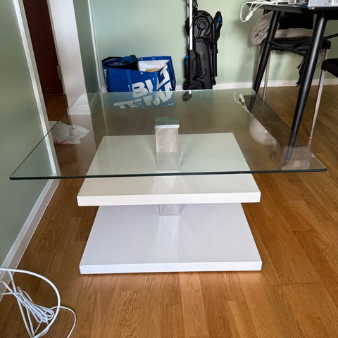 Vitt soffbord säljes pga. flytt. Är något vingligt men kan säkerligen skruvas åt (vi har inte orkat). Har några skavanker på skivan men till synes bra skick. Bordet är 80cm i diameter och 45cm i höjd. Pris går att diskuteras vid snabb affär.