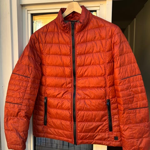 Hugo Boss grå vinterjacka med avtagbar huva av päls. Jackan har flera fickor fram och en innerficka. Muddar vid ärmslut. Storlek 46, men upplevs som M.
