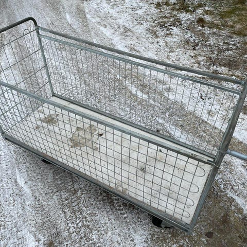 Längd: 95,5 cm (lastyta) Bredd: 70 cm Höjd: 98 cm (med hjul) 20 cm kraftiga hjul två svängbara och två fasta. Riktigt bra vagn som jag inte har behov utav längre. Finns mer vagnar, häckar osv som ska säljas.