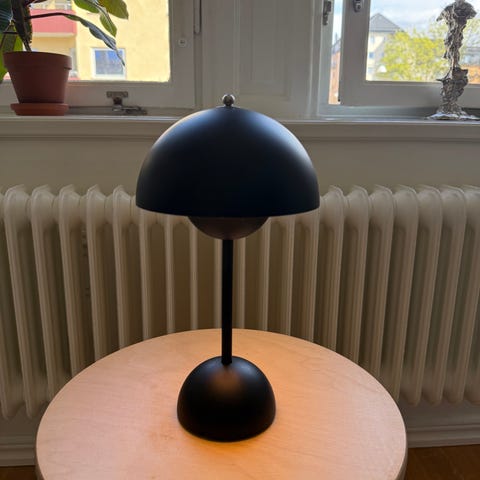 Ett unikt bord av massiv behandlad ask med designklassikern Flowerpot VP2 pendellampa av Verner Pantons integrerad. I det här smarta bordet har pendellampan byggts in i ett bågformat rör som är integrerat i ett av bordets ben, som gör det möjligt att få ett ljus även i miljöer där det inte finns möjlighet att hänga en takarmatur. Flowerpot VP2 av Verner Panton är en välkänd stilikon och har vunnit flertalet designpriser. Den är formgiven med inspiration från Flower Power epoken men med en modern twist. Här i mörkgrönt utförande som matchar bordets mörkgrönt lackade stålben. & tradition