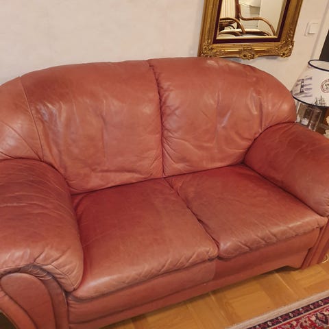 Tygg/läder. Läder i mörkbrun färg. Tygget i mörkbrun färg med svart detaljer. Använt skick enligt bilder. 2 sidobord i mörkbrun färg.