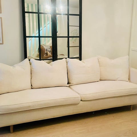 Ett flyttbart nackstöd i samma tyg medföljer. Soffan är 332 cm bred, 101 cm djup och har en schäslongdel på 148 cm djup – perfekt för både vardagsmys och större sällskap.