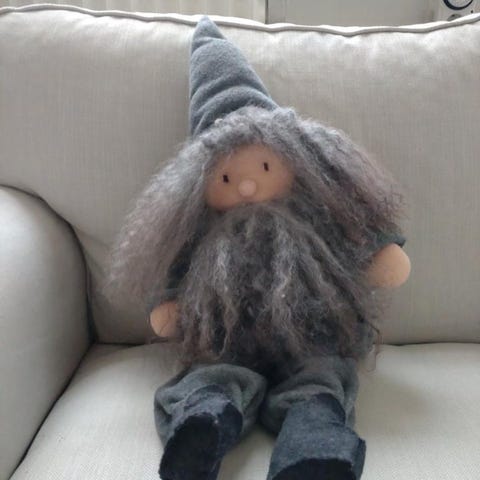 Antik tysk Jultomte som sitter på en stubbe