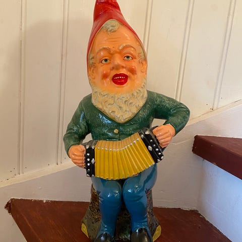 Antik tysk Jultomte på stubbe spelar dragspel Tomte 1940-ta