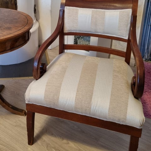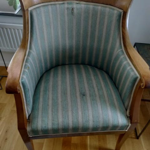 En fin nyrenoverad skrivbordsstol från början på 1900 talet. Skrivbordsstolen är nyomkläd av en professionell möbeltapetserare och inte använd sedan omklädseln. Märkt under: Tidaholm Bruks AB kongl. hovleverantör, Tidaholm. Säljs tillsammans med en tillhörande stol av samma leverantör (bild 5 och 6). Pris för båda 2650kr