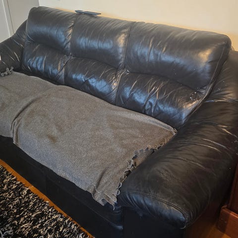 En mörkgrå 2-sitssoffa i konstläder troligen. Har bara stått och dammat och använts mest som en avlastningsplats för kläder.
