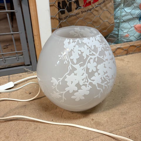 Lampan har en träram och en svart sladd med strömbrytare. Max 40W glödlampa rekommenderas. Sladdlängd 3,5 meter.