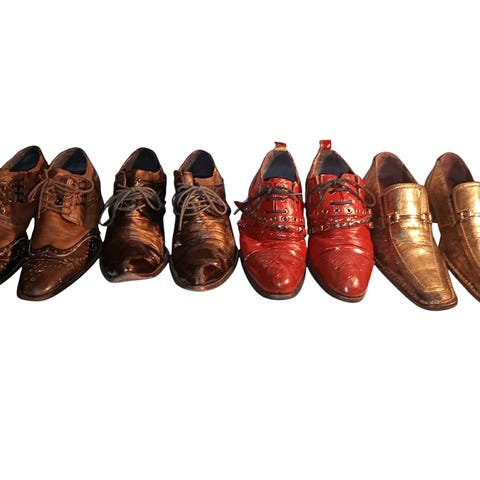 Köpt i Japans huvudstad Tokyo på speciellt urvald skobutik. Storstadsmode och exklusiva skor som det inte går att få tag på i Sverige och i Europa, köpta på plats i Japan. Skorna är lite avlånga och har en spetsig tå. Flertalet dekorativa inslag och detaljer på skor.