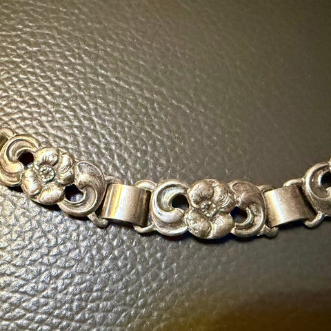 Det orientaliska utsmyckade nålarmbandet är en rikt detaljerad hyllning till traditionell design och visar upp intrikat hantverk i oxiderat Silver. Vikt 100gram. Längd 17 cm. Bredd 4,5 cm. Armbandet består av alternerande rader av blommiga, prickiga och markisformade element som sammanlänkas av smala nålformade stänger och bildar ett brett, flexibelt band med en djärv, antik finish. Det mörka silvret framhäver varje fin detalj och ger djup och textur till det upprepade ornamentala mönstret. Detta handgjorda silversmycke är perfekt för dem som uppskattar specialdesignade smycken med rötter i kulturell inspiration från Sydafrika, Johannesburg och erbjuder en slående blandning av arv och hantverksmässig elegans. Sista bilden visar ett köppris på aktuell plats.