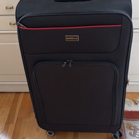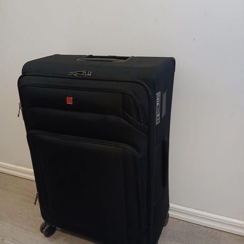 En fin Stor svart resväska med två fack på utsidan med dragkedja. Höjd.ca.77cm Bredd. ca.48cm. Innermått. längd. ca.65cm Bredd. ca.45cm. Djup. ca.28cm Höjd på handtaget ca.28cm Har 4st hjul